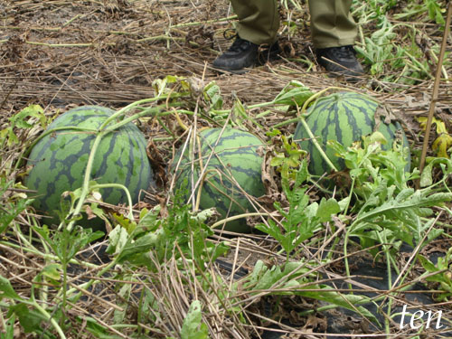 畑に大きなスイカがゴロゴロ