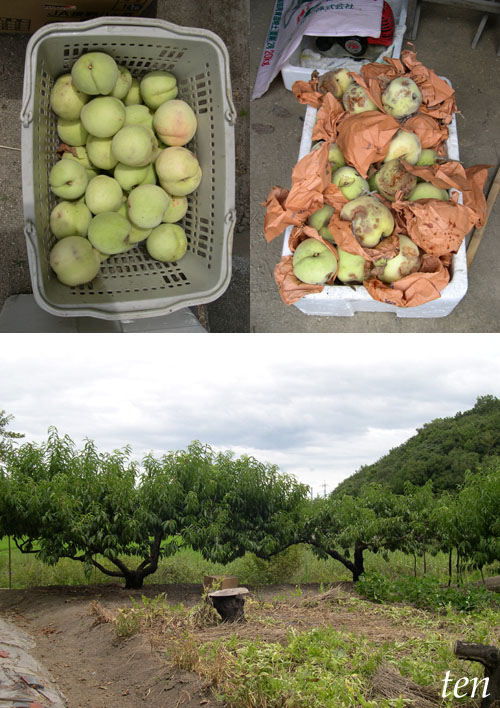今年は、ゴールデンウイーク後に、ちょっと体調を崩した義父。毎年作っているモモの、果実一つずつへの袋かけはできたけれども、木全体をすっぽり覆うネットを、かけることができなかった。そのせいで、蛾に、おいしい果実を先取りされてしまった(↓写真上右)。傷がついていないのは、まだ硬い、青い果実ばかり(↓写真上左)。↓写真下の、枝を大きく広げているのがモモの木。これらの木を囲むように張っていたネットを、義父、ダー、私の3人で外した。そして義父とダーはモモの収穫。