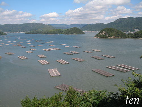 帰省途中の車窓から瀬戸内海のカキの養殖いかだ