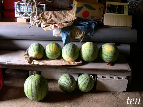 納屋にもゴロゴロ転がる、とれたてのスイカ