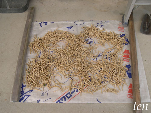 収穫したナツアズキを、さやごと納屋の軒下に干す