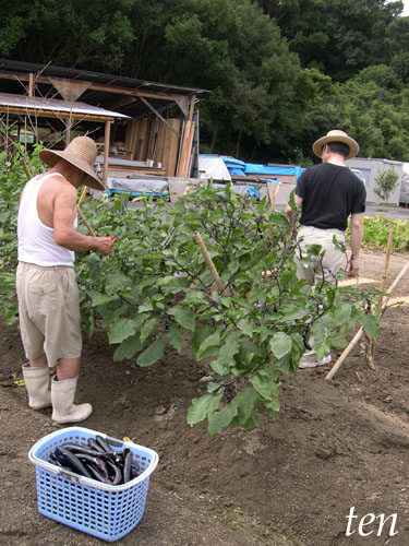 ナスの収穫カゴの下のほうには、収穫したてのキュウリとピーマンもキュウリの枝の摘み方も教わる。雌花(キュウリの赤ちゃん)がついている節の、もう一つ上についている葉を1枚残し、そこから上に伸びている蔓を切る。こういう手間のかかる作業を経て、おいしいキュウリにありつける。私は食べるだけの人><