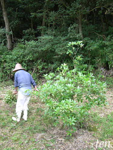 お墓に供えるシキミ(シキビ)を摘む