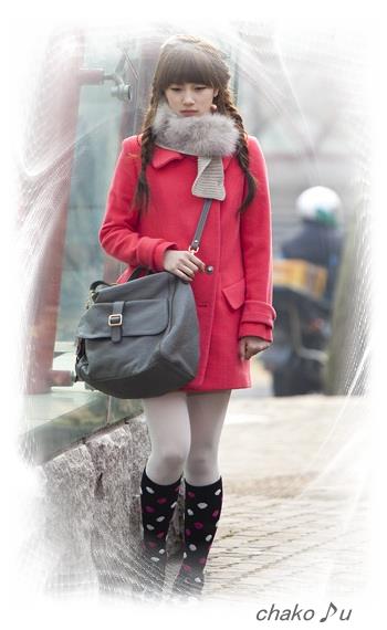 奥から出て来た妹のヘソンは コートを着てパンを食べながら出てくる。