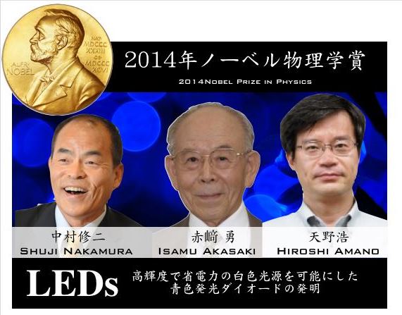 赤崎勇教授、天野浩教授、中村修二教授。