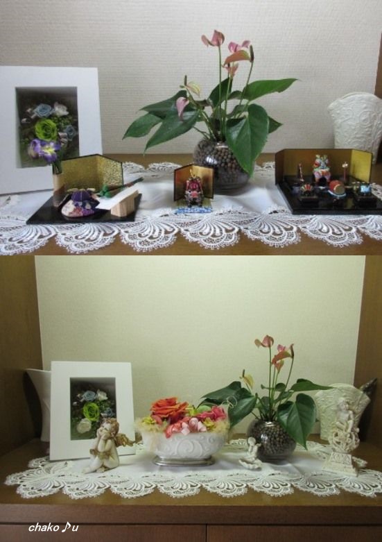 玄関の下駄箱の上で遊んでいます♡
